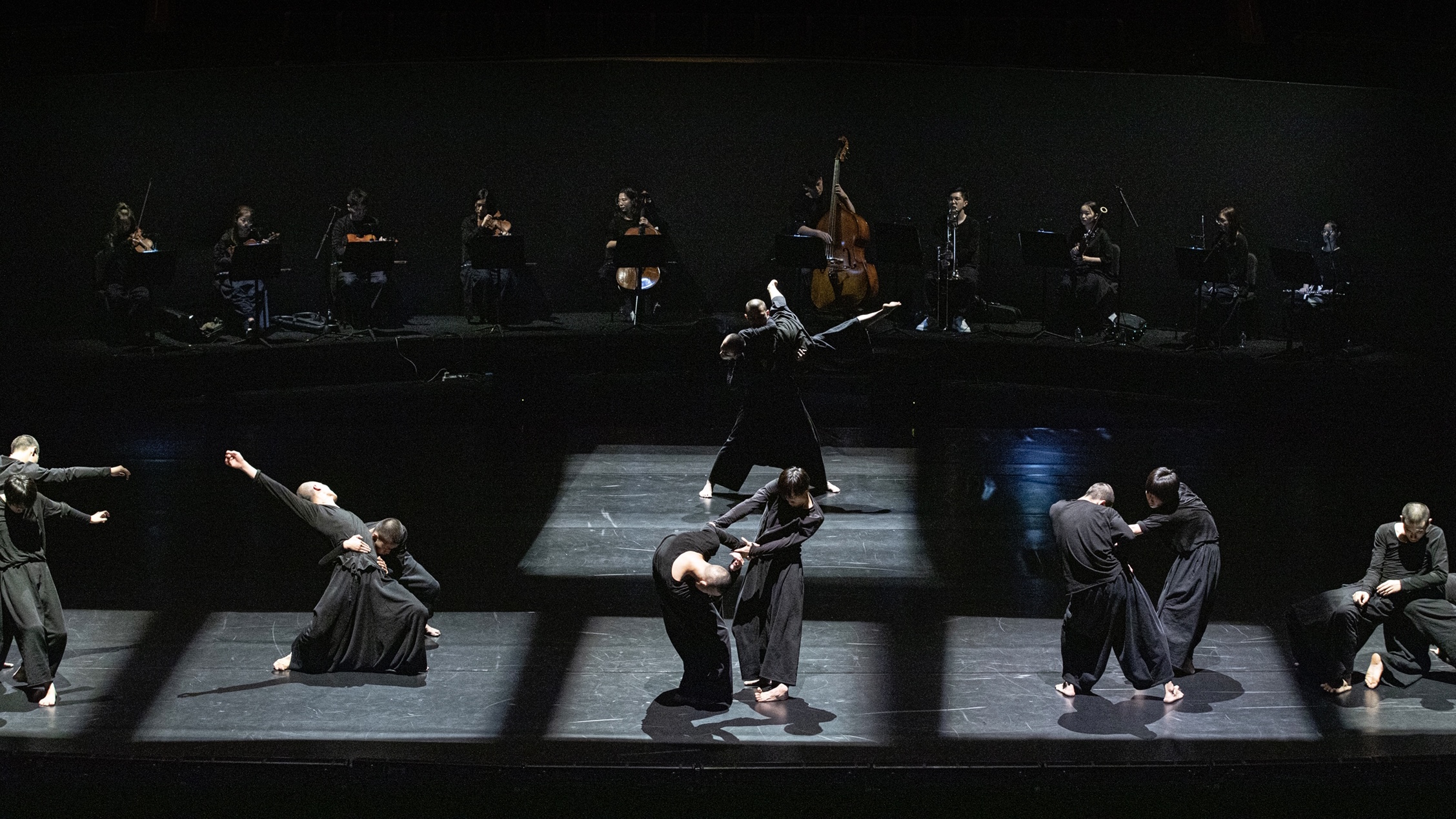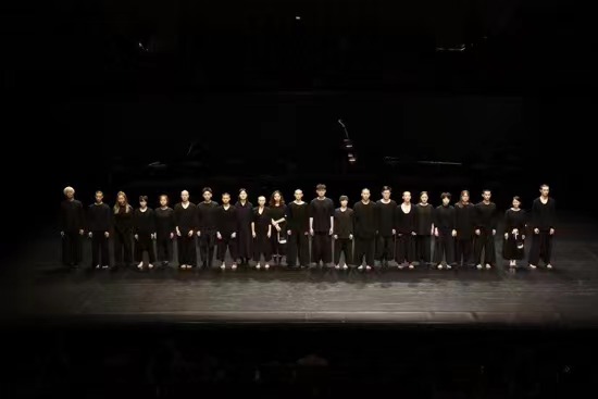 当晚7点半,演出正式开始,随着小河的一声哼唱,灯光缓缓亮起,伴随着音乐声和人声,身着黑色长衣长裤的12位舞者舞动着身躯,在舞台上展现着身体的的无限可能。配合灯光,舞台上的人影深浅不一,重叠、交织在一起,仿佛构成了另一场演出。