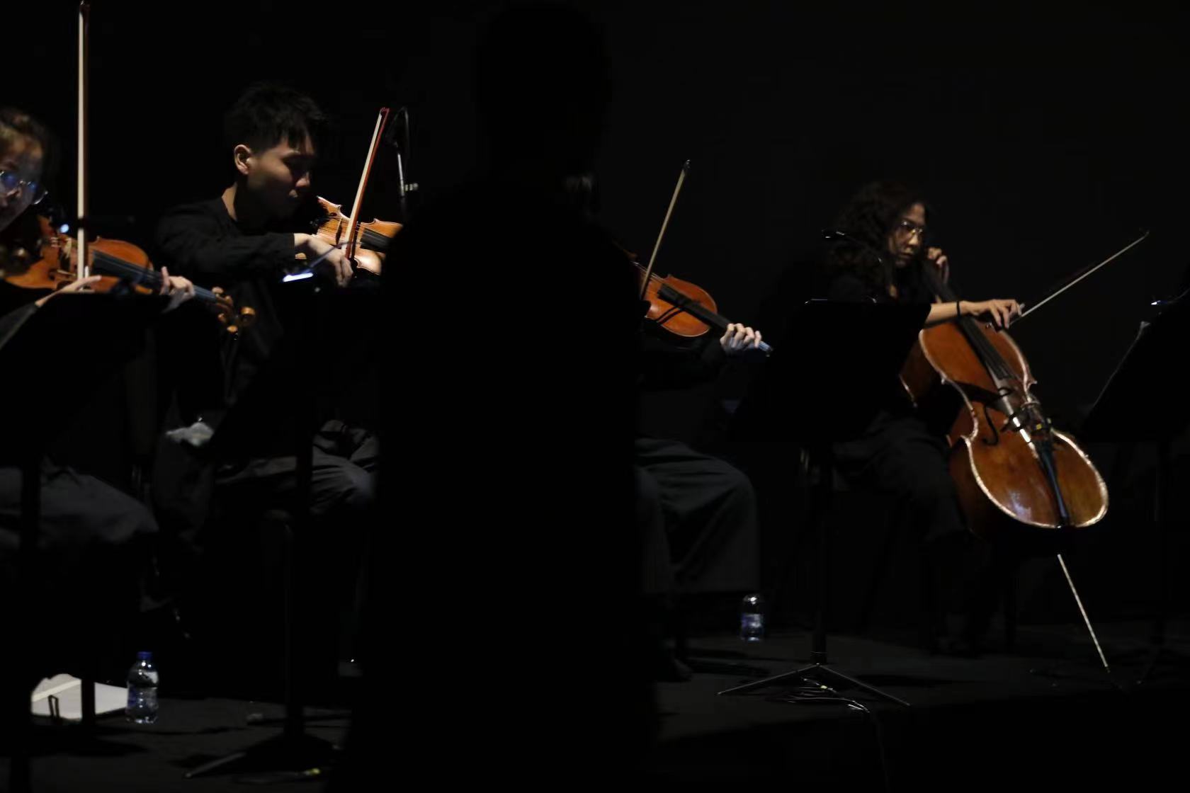 而这一次在上交音乐厅的演出同样也是一场实验,一次即兴演出。三天的排练时间,小河甚至没有提供给乐团曲谱。小河表示:“我们要感谢上交音乐厅,包括Misa主办方,他们帮我们招募了10位来自不同地方、愿意一起尝试创新的年轻乐师们,组成临时乐团。我只给了他们一些排练的提示,包括如何做这场演出的一些规则,以及与主题相关的内容。言下之意,当乐师听到他人在拉或吹时,他们可以任意选择一个对象,根据被选择者的声音和他对话与互动。但选择与被选择者相互之间都不知情,所以其实每个乐师都在和一个实际存在但未知的人互动着,形成一种‘变异’感。随后,音乐还会在此基础之上继续发展,从‘单方面’交流变成‘双方面’互动。不过,这种‘即兴’其实也有限制,因为大家磨合的时间较短,如果所有人都‘即兴’展开自己的旋律,那么演出的声音会非常难控制,故而我们还是做了反复的沟通和一定的限制,才最终为大家呈现了这场演出。可以说,乐师们都非常棒得完成了这场演出。”