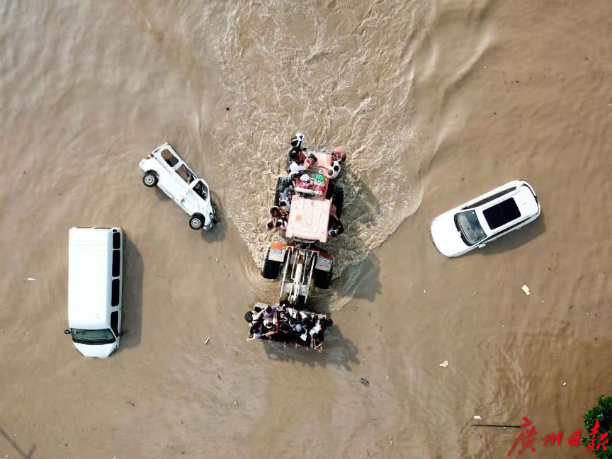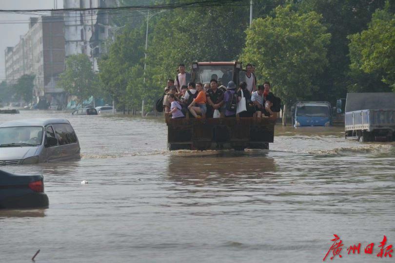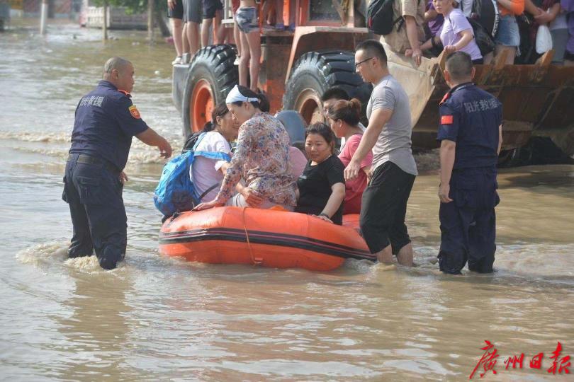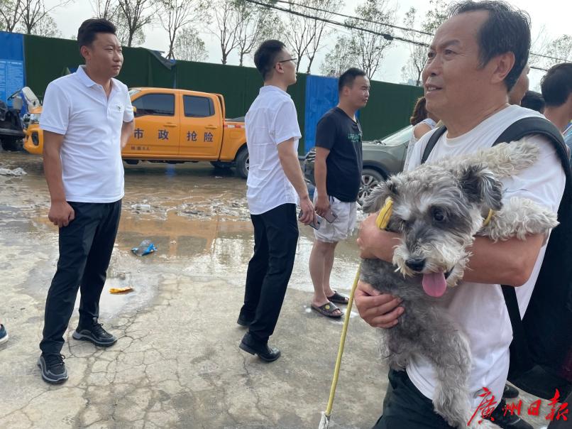 广州日报·新花城记者在现场看到,救援人员转移群众主要依靠皮划艇和铲车,其中有孕妇、婴儿、小孩、老人,甚至宠物狗。