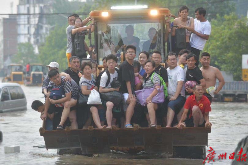 铲车车轮高约2米,可顺利往返被积水围困的中央花园和安全区,铲车上通常可以站立10多名被困群众。此外,还有热心的河南市民听闻现场需要皮划艇后,专程一大早将自家的皮划艇送到这里。