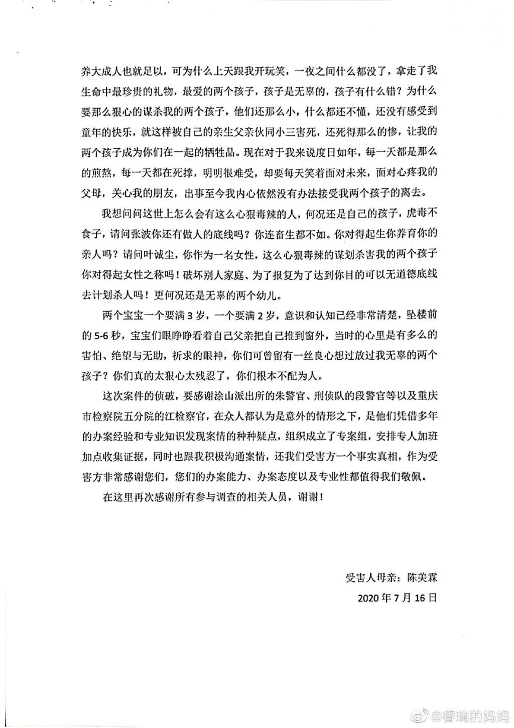虽然她没把前夫想太坏,但在当时,网络已经有质疑的声音。有网友建议她:“告他(张波)蓄意谋杀”,还有网友表示,不相信两个孩子无缘无故掉下去,一定有原因,一定要彻查。