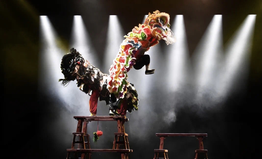 当晚,演出一开场表示传统南狮表演,主创团队严格遵循传统,不但使用斤两十足的古制狮头,还垒砌三层桥凳让演员攀爬跃纵。很多观众是第一次看传统南狮表演,大呼过瘾。