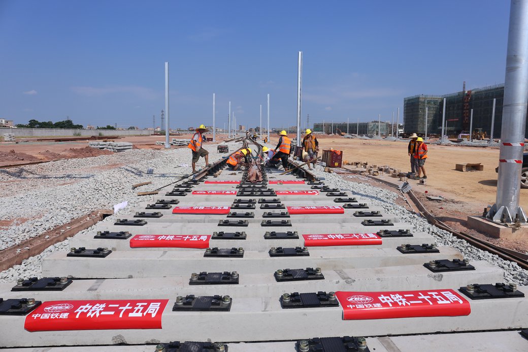 7月25日8时,在中铁二十五局承建的广佛东环线竹料存车场施工一线,随着30余名建设者完成测量、上砟、上枕、铺轨等作业,第一根25米长的钢轨精准落在轨枕上。这个未来将承担广佛环、穗莞深、新白广3条珠三角城际铁路“动车旅馆”重任的存车场,进入了铺轨施工阶段。