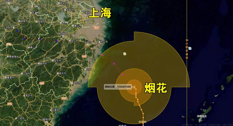 24日20时,上海中心气象台发布台风橙色预警:预计25日上海将出现阵风12级以上的大风。台风“烟花”24日至26日会给上海带来明显风雨影响。强降水主要集中在25日至26日,雨量可达暴雨到大暴雨,局部地区有特大暴雨。