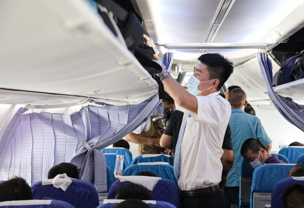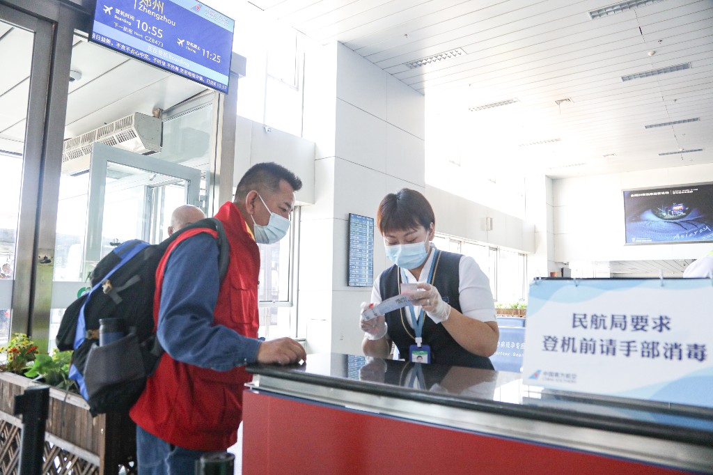 7月25日当天,南航在乌鲁木齐国际机场T3航站楼开设两个专用柜台保障支援人员顺利出行。在每个队员的登机牌上方,都粘有“豫新同袍 共克时艰”的字样。此外,为确保支援人员的行李可以快速、安全、准确运输,南航为全部行李加装了团队行李标识带。