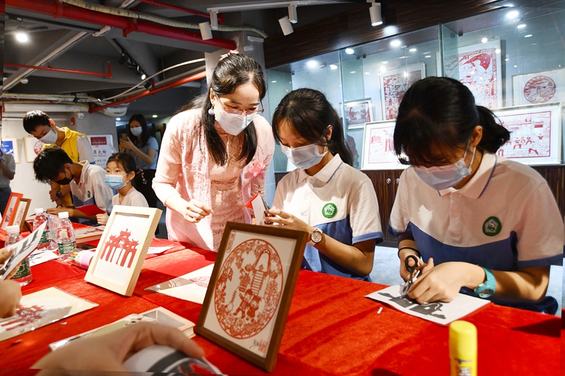 在本次展览中,主办方在展览现场设置了剪纸体验区,国家级非物质文化遗产项目剪纸(广东剪纸)市级代表性传承人邓春红一边讲佛山剪纸艺术知识,一边教市民裁剪以建党100周年为主题的剪纸作品,让市民了解建党百年历史以及“沉浸式”体验佛山剪纸艺术的独特魅力。