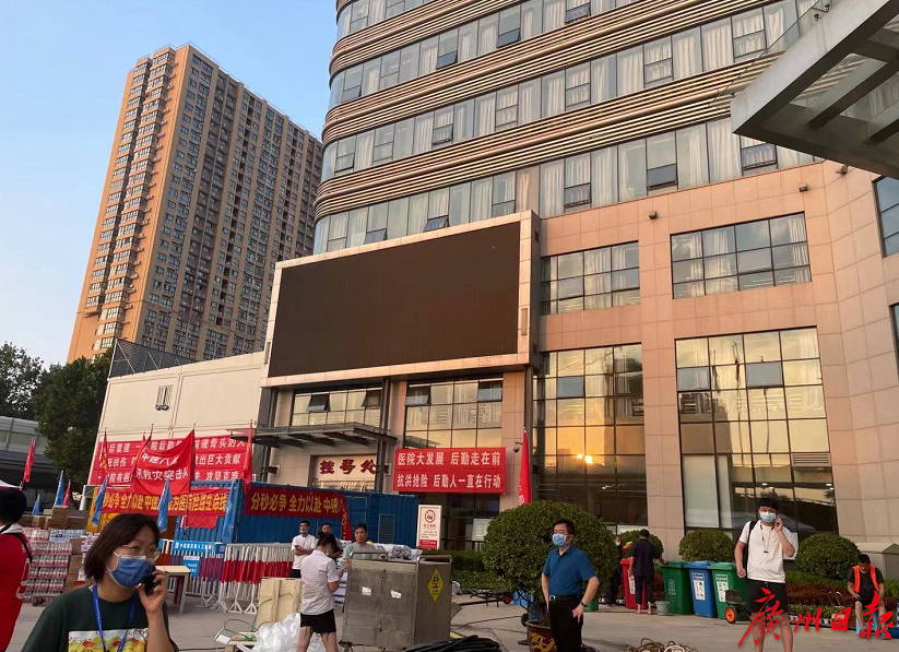7月25日下午6时,记者在医院门口见到,目前医院的灾后重建工作依然在进行,其中中建二局还在为医院抢修生命线通道,三台移动CT、两台平安产险应急救援车辆和中国电信的应急通信车停在医院周边。而来自江苏的消防队员目前已完成排涝工作,当天晚上7时,郑州大学第一附属医院河医院区全体医护人员,拿着鲜花和锦旗再次感谢并欢送江苏消防。
