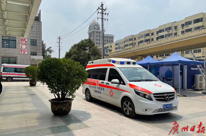 记者在现场看到,目前河医院区门诊部迎来不少的市民前来就诊,急诊楼门前也随时停放着重症患者转运救护车辆,此外还有三台移动CT停靠在发热门诊部周围。为了解决医院暑热问题,大堂内放置了若干桶冰块和风扇降温。