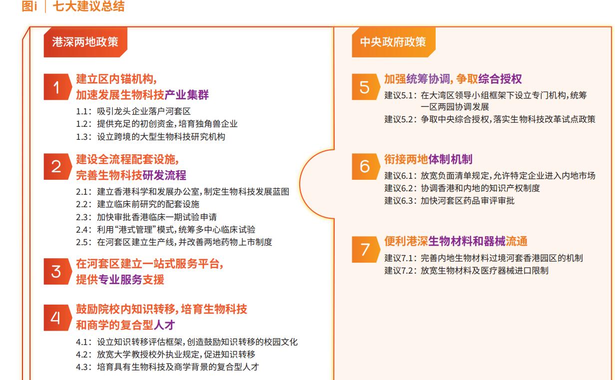 同时,报告提出了七大亮点建议:建立区内“锚机构”,加速发展生物科技产业集群;建设全流程配套设施,完善生物科技研发流程;在河套区成立一站式服务平台,提供专业服务支援;鼓励院校内知识转移,培育生物科技和商学的复合型人才;加强统筹协调,争取综合授权;衔接两地体制机制;便利港深生物材料和器械流通。