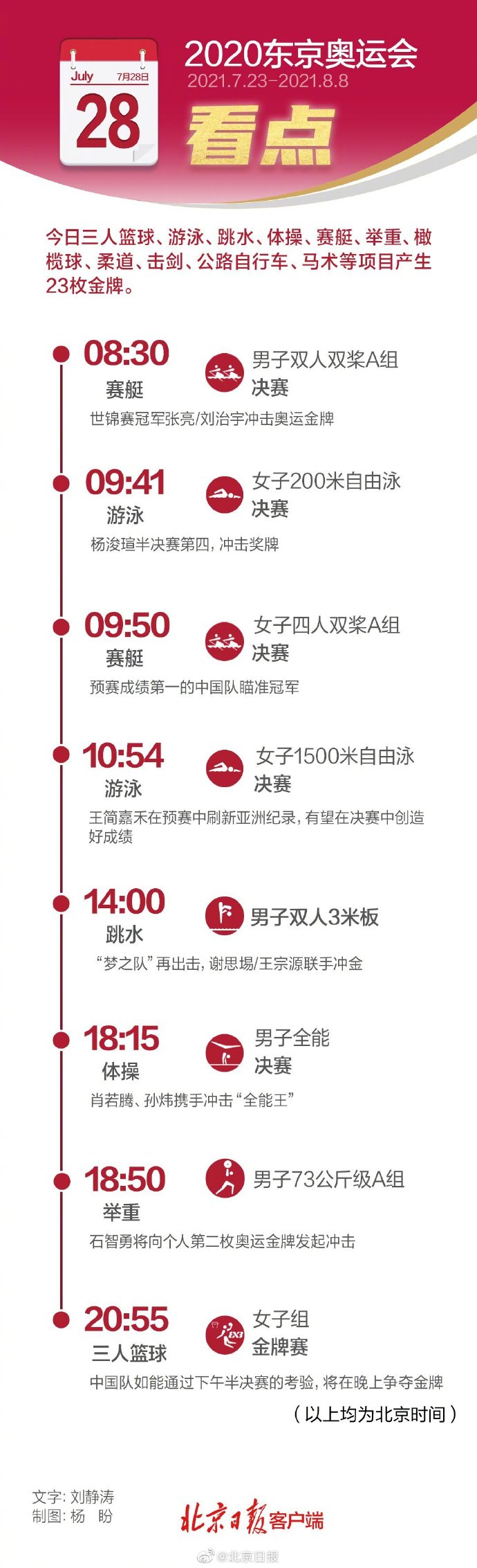 7月28日,2020东京奥运会进入第五个金牌日的争夺,本日总共进行25个大项的比赛,将产生24枚金牌,分布在公路自行车(2)、击剑(1)、体操(1)、举重(1)、马术(1)、七人制橄榄球(1)、柔道(2)、赛艇(6)、三人篮球(2)、跳水(1)、铁人三项(1)、游泳(5)。
