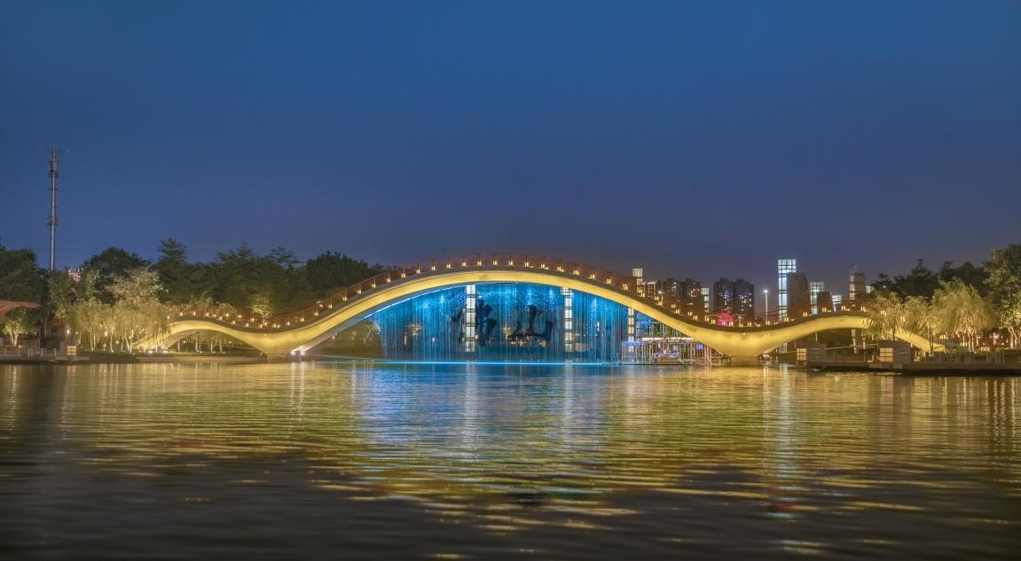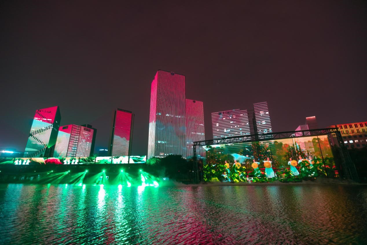 屏幕从水底升起,哗啦啦的水声让夜跑的市民、嬉戏的孩童、耳语的情侣不约而同地望向湖面。陡然间,灯光亮起,龙舟、醒狮、武术、粤曲等轮番在全息投影屏上流转,让人眼前一亮。视线由近往远扩展,湖中亭榭的屏幕不断翻转调整播放角度,横跨湖面的桥梁下起了光影水帘,四周高楼的外立面不断地变化色彩……光影转换呈现的唯美画面,让驻足欣赏市民的拍手叫好。