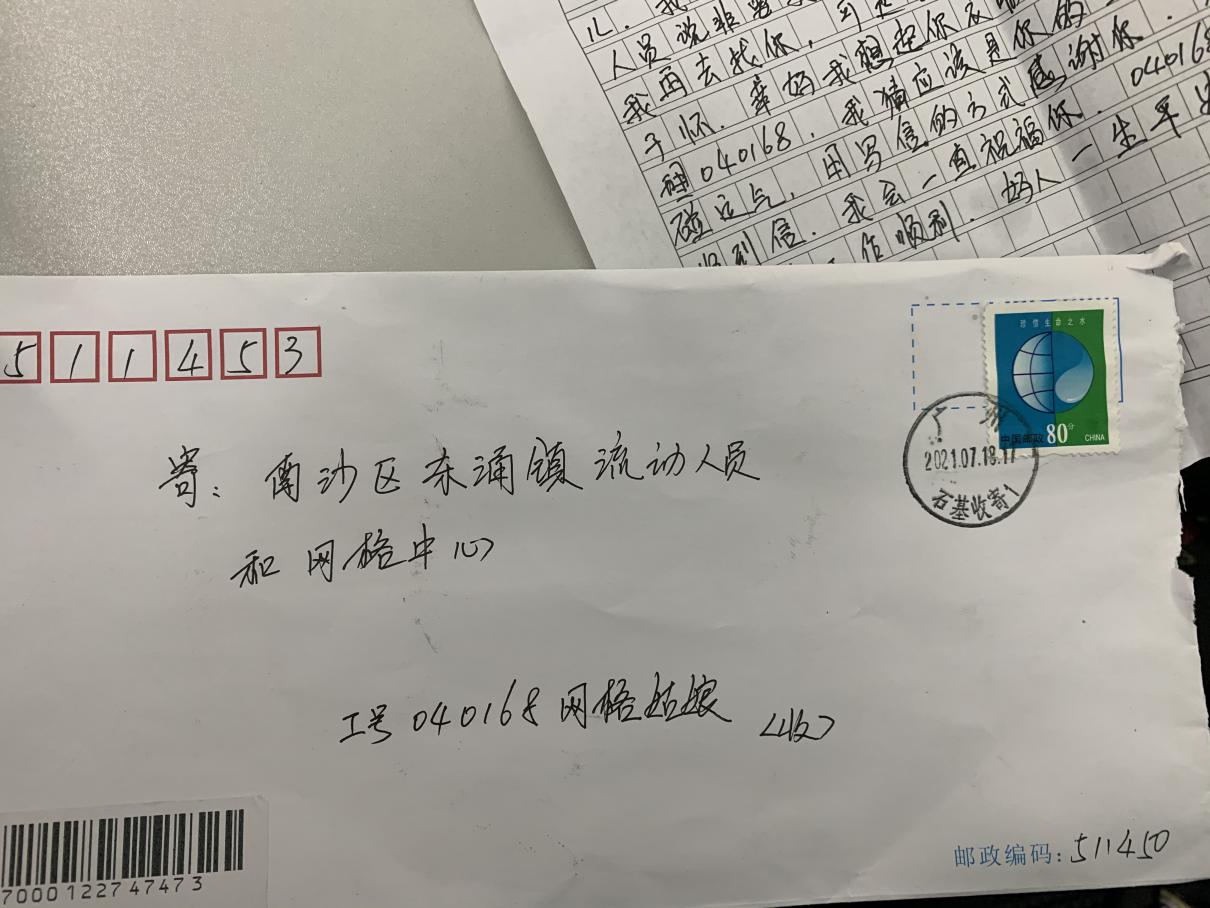 “编号168是哪位同事?有一封她的来信。”7月19日,广州市东涌镇网格中心收到了一封非常特别的信件,这封信没有明确的收信人姓名,仅仅在封面写着“工号040168网格姑娘(收)”。