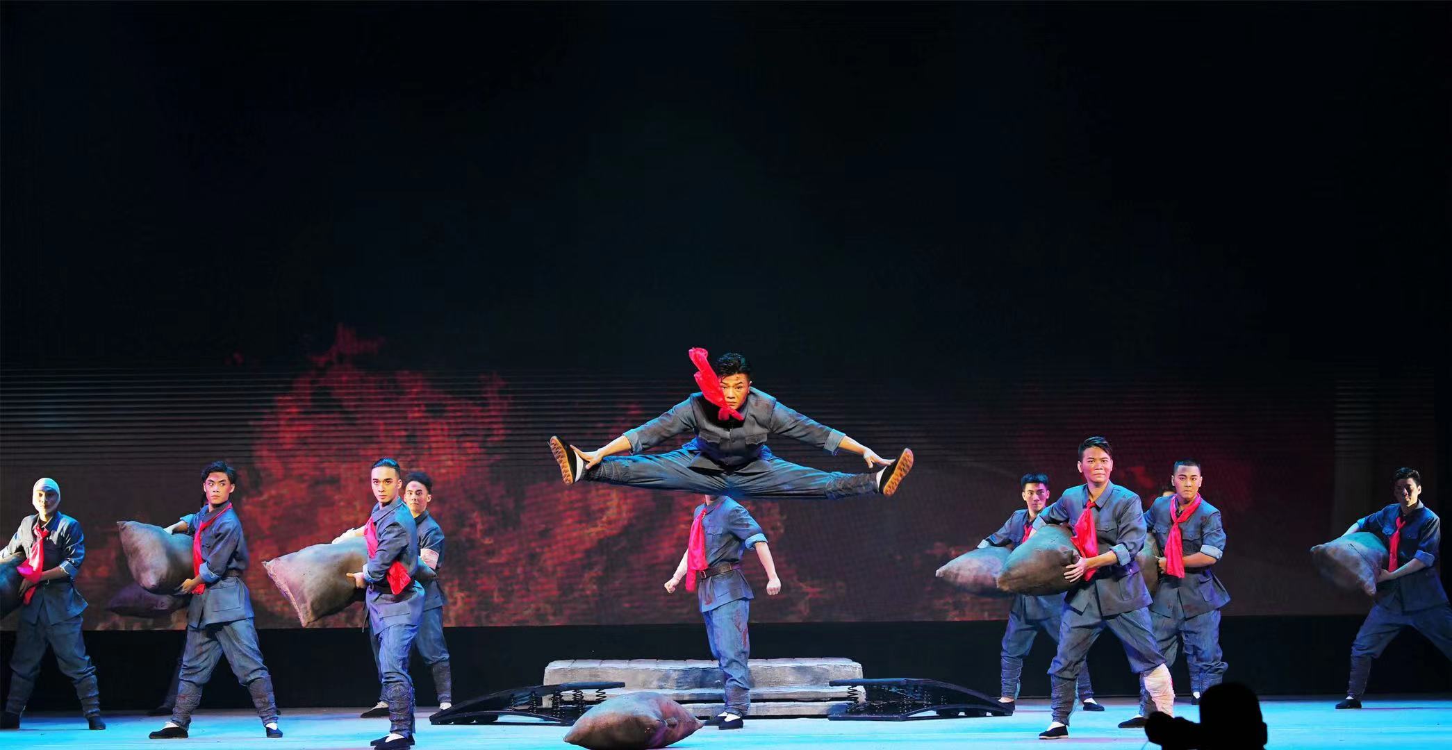 如剧中李嘉宜饰演的陈文婷在收到周炳的信时,运用了戏曲花衫行当的身段来表现内心的喜悦;陈振江饰演的周炳在参加“敢死队”冲锋中,则融入了武生的身段和程式;“敢死队员”们的群戏又将戏曲跟斗表演与现代舞相结合,集中表现革命的壮烈。