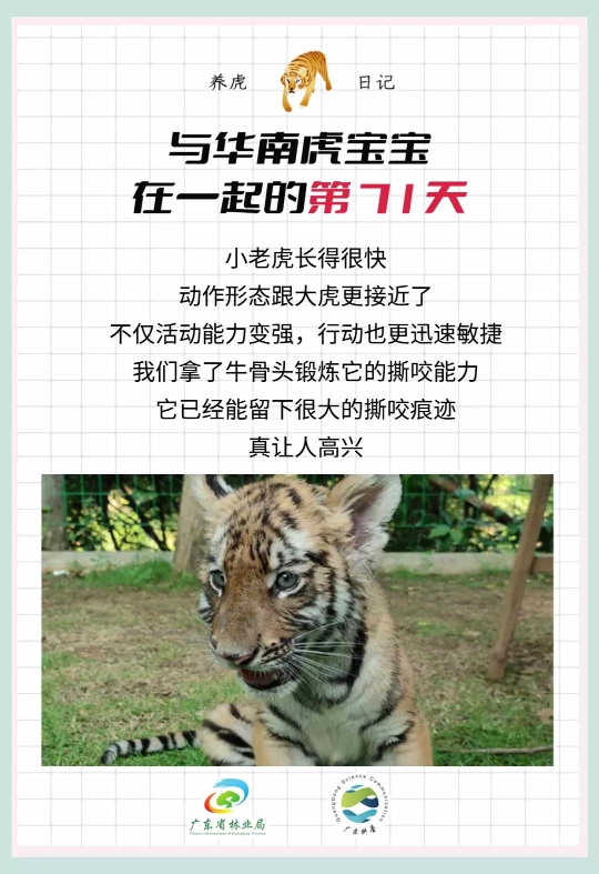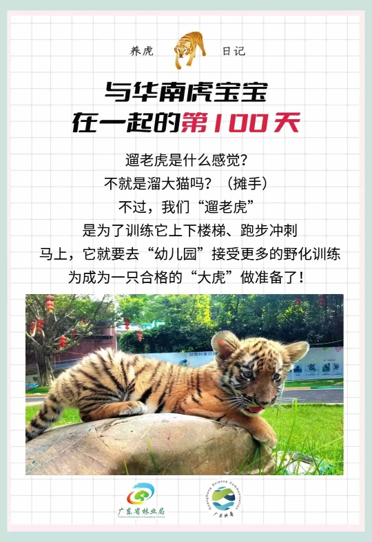 如今,这只珍贵的华南虎宝宝已安全度过了百日,能与饲养员一起外出散步、玩耍,体重也达到了30多斤,约等于3.5只橘猫。7月29日,在“世界爱虎日”到来的当天,在韶关市还举行了一场妙趣横生的“探秘南粤最萌华南虎宝宝”直播活动。现场为今年3月24日出生的小华南虎进行揭牌授名,并正式将其移送进 “幼儿园”。小华南虎经网络征名及投票后,最终由评审团确定命名为“圆圆”。