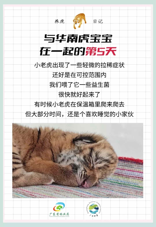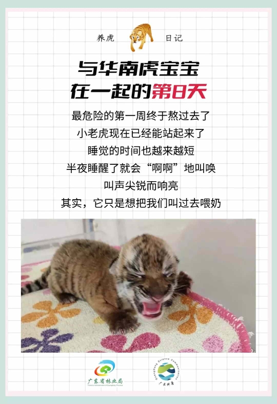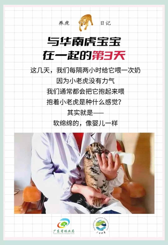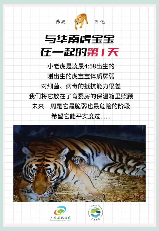 2021年3月24日凌晨4:58,一只雌性华南虎宝宝在韶关市华南虎繁育研究基地出生。如今,世界上仅存的华南虎仅有200余只,野外种群基本灭绝。华南虎曾被列为“世界十大濒危动物之首”,同时,它也是中国特有物种,又称“中国虎”。在华南虎繁育研究基地出生的这只虎宝宝,牵动着众人的心。从出生第一晚的虚弱无力,到度过第一周的危险期,再到后来,慢慢学会抓东西、抢奶瓶……