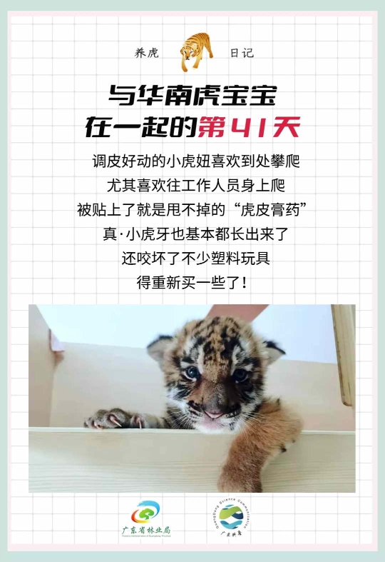 据工作人员介绍,虎宝宝的虎爸名为“小满”,虎妈名为“梦梦”,所以取“圆满圆梦”的含义。据介绍,“圆圆”已经因为它的“萌值”走红网络,“华南虎宝宝要上幼儿园啦”一度冲上微博热搜榜,话题阅读量高达3649万!韶关这只超萌“神兽”7月29日开始上“幼儿园”,接受攀爬扑食的技能训练。这就意味着市民朋友们,可以来到韶关华南虎园围观“圆圆”啦!