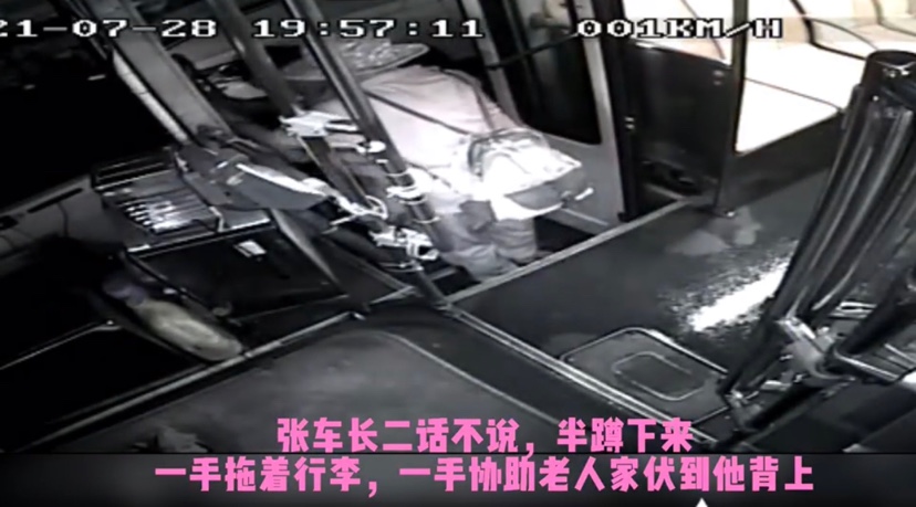 车厢里,一位阿婆携带手拉车,面对如此深的积水,显得进退两难,不敢下车,被迫停留在车厢内,这一情况被细心的张车长留意到了,于是张车长问她:“您是否需要我的帮忙?”当张车长得知阿婆心急想回家时,他二话不说,做出一个暖心的举动——自己变身临时“摆渡人”!张车长半蹲下来,一只手协助阿婆伏到他背上,另一只手拖着手拉车,再背起阿婆,一步一步地走过水浸区域,把老人家背到可以遮雨的安全高地才把他放下。