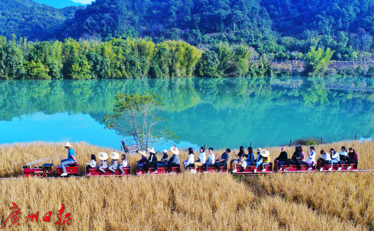 在从化区米埗小镇里,游客乘坐小火车穿过金色稻田,旁边是碧绿色的流溪河。扫码欣赏广州乡村之美。