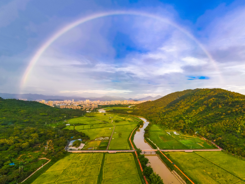 雨后彩虹横跨于从化艾米稻香小镇的稻田上,一派田园美景。