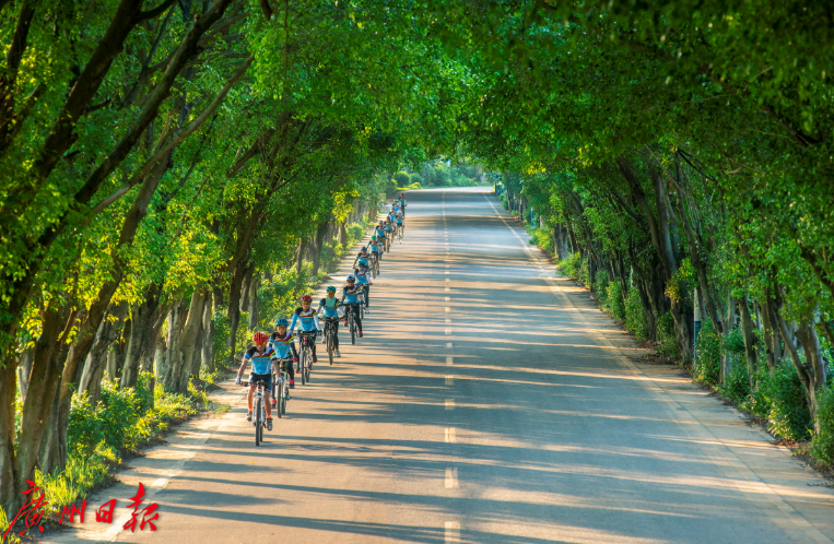 在环境优美的白云区米岗村里,一支自行车队从林荫路上经过。