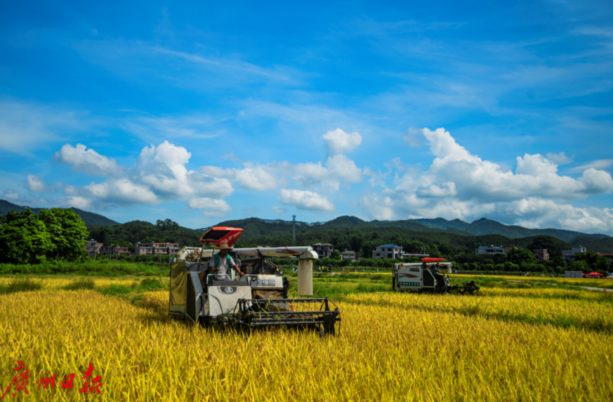 7月,增城区中新镇濠迳村迎来丰收,农民正在收割稻谷。
