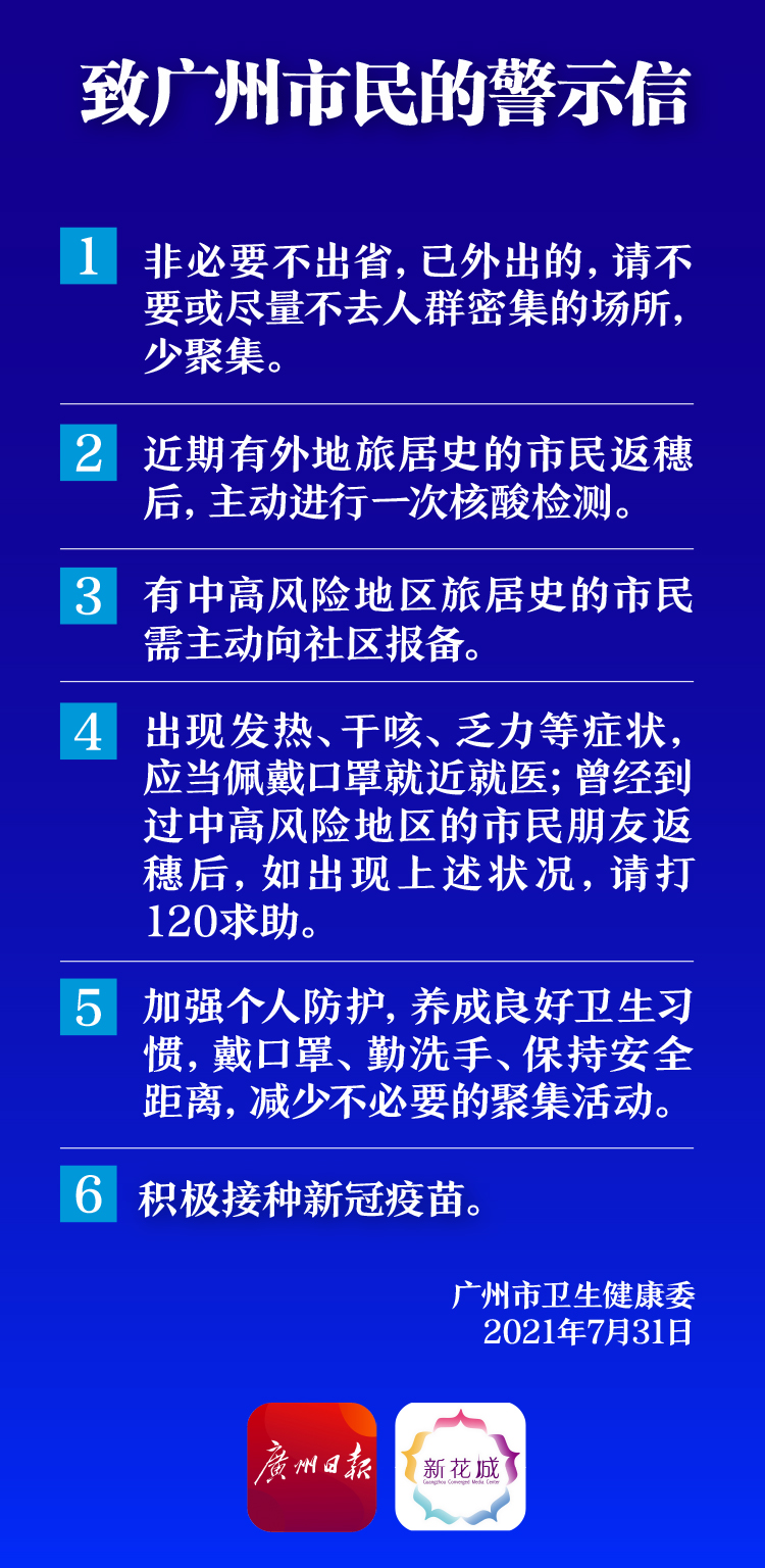 今天中午,广州市卫生健康委通过官方微信公众号向广州市民发出警示信,呼吁市民非必要不出省;近期有外地旅居史的市民返穗后,主动进行一次核酸检测;有中高风险地区旅居史的市民需主动向社区报备;出现发热、干咳、乏力等症状,应当佩戴口罩就近就医;加强个人防护,积极接种新冠病毒疫苗。