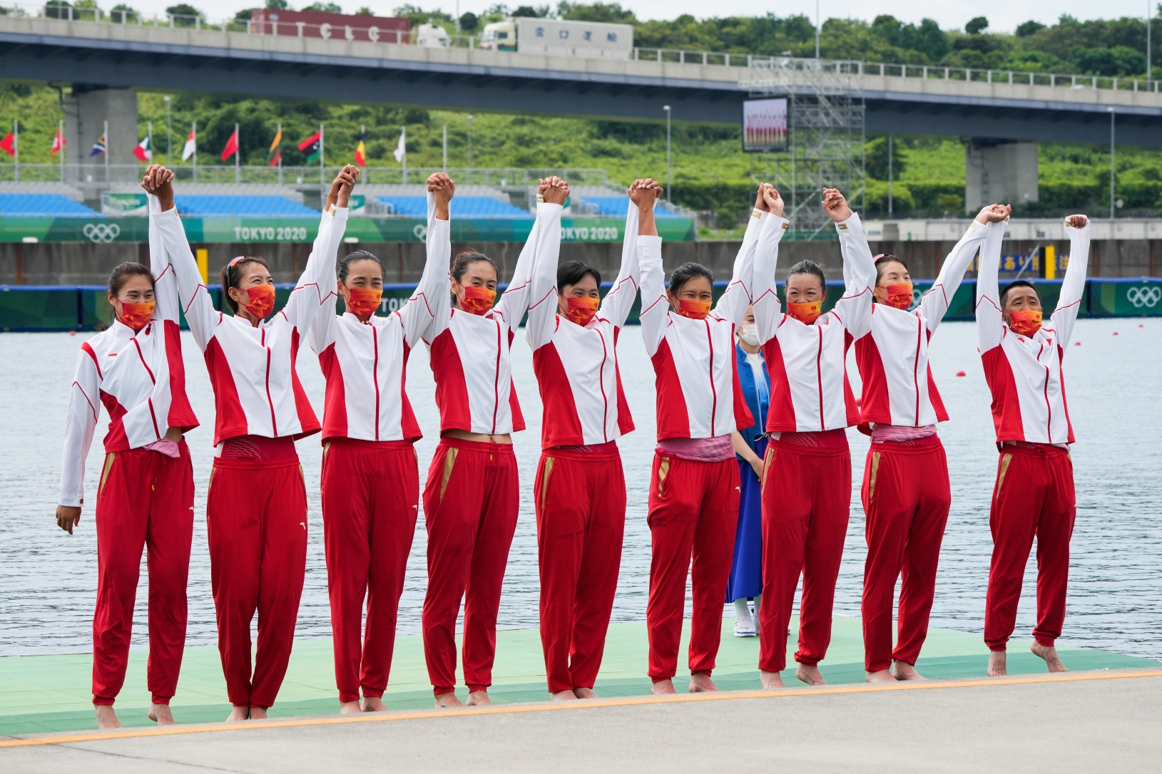 中国女子八人单桨选手为王宇微/郭淋淋/李晶晶/巨蕊/张敏/苗甜/徐菲/王子凤和舵手张德常。