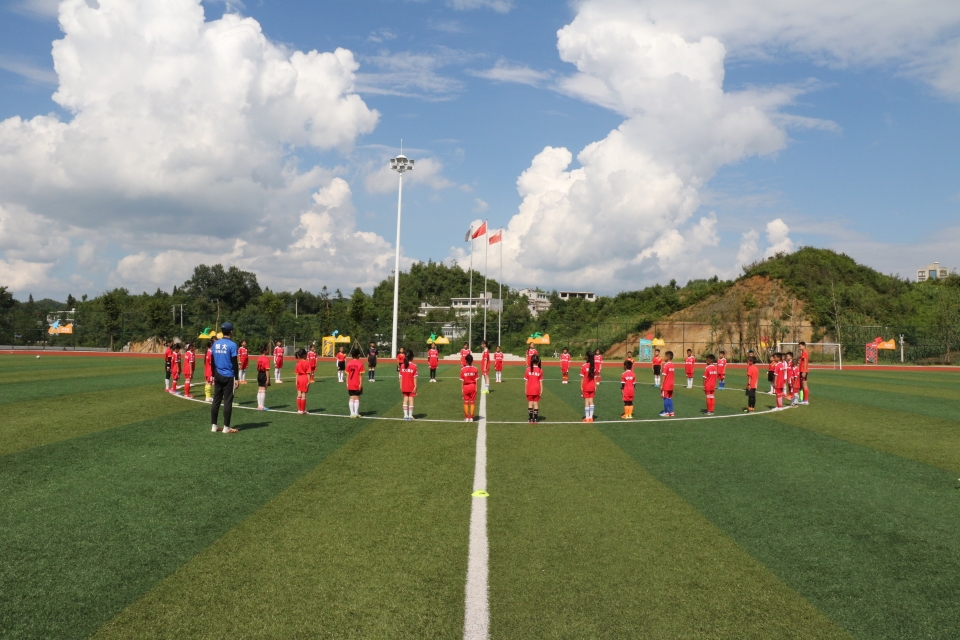 “五星红旗迎风飘扬,胜利歌声多么响亮”,嘹亮的歌声响彻云霄,大老远就能听到。这是足球队的孩子们训练前在呼歌。呼歌结束后,训练正式开始,一群小球员身着鲜红球衣在蓝天白云下挥汗奔跑,像是一簇簇跃动的小火苗。