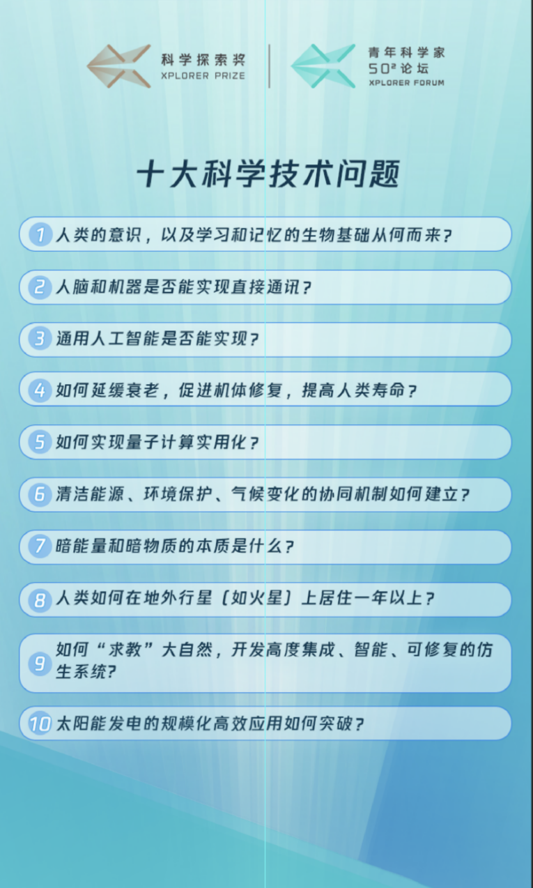 本次活动的一个亮点,就是发布2021年青年科学家502论坛“十大科学技术问题”,由100位“科学探索奖”获奖者共同发起和投票选出,代表了中国青年科技工作者的前沿科学洞察,问题涵盖人类意识、人机通讯、量子计算实用化、地外行星居住等学术界和社会共同关心的热点领域。主办方表示,“十大科学技术问题”的发布,未来将成为“青年科学家502论坛”的“招牌”,既集聚中国当代青年科学家的思考和观察,也将为社会大众所关心的现实和未来问题提供科学映照。