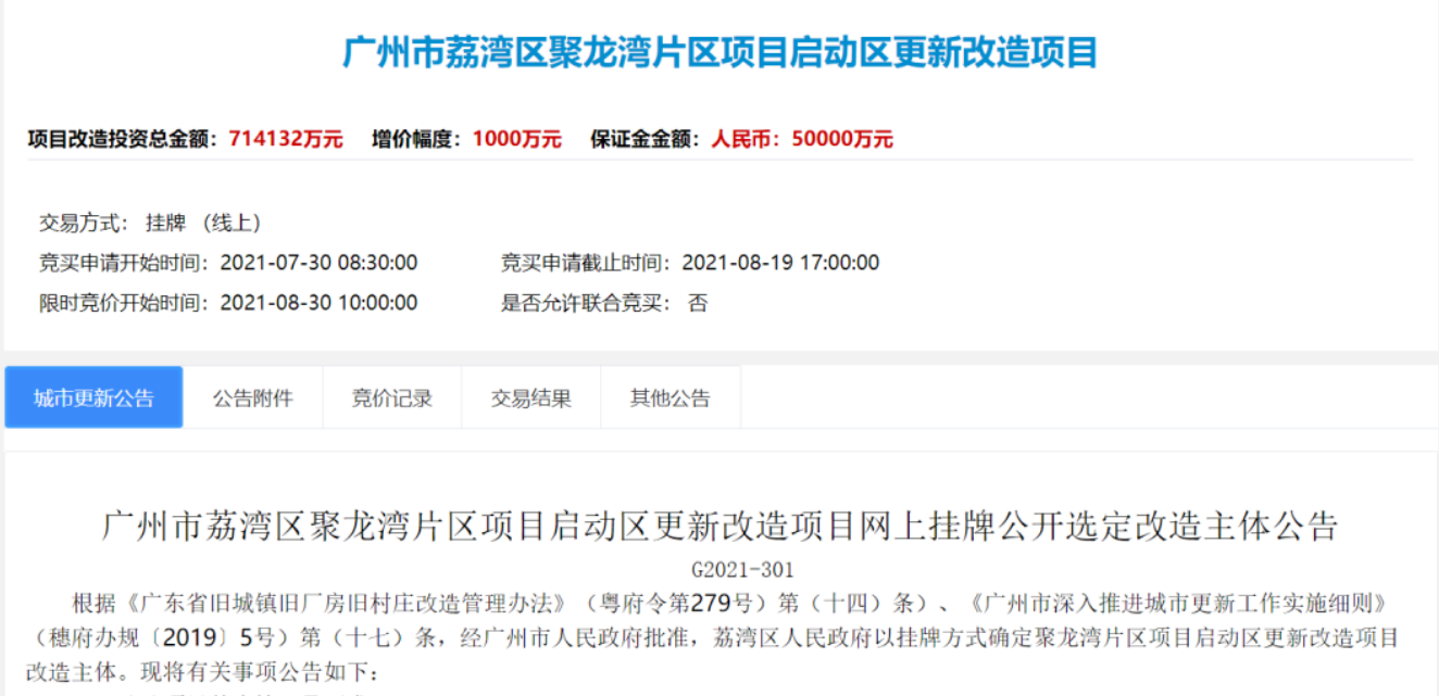 该项目采取旧城连片更新改造(混合改造)的改造模式,本次项目挂牌起始价为71.4132亿元,按“价高者得”原则确定竞得人(改造主体)。限时竞价时间为年8月30日10时起。聚龙湾片区的地理位置十分优越,为串联广佛两市的重要节点,其位于荔湾区芳村大道东两侧,北至花蕾路,东至珠江,南至浣花路,西至沙涌,片区内将有地铁 11 号线、广佛线、25 号线共三条地铁线穿过。