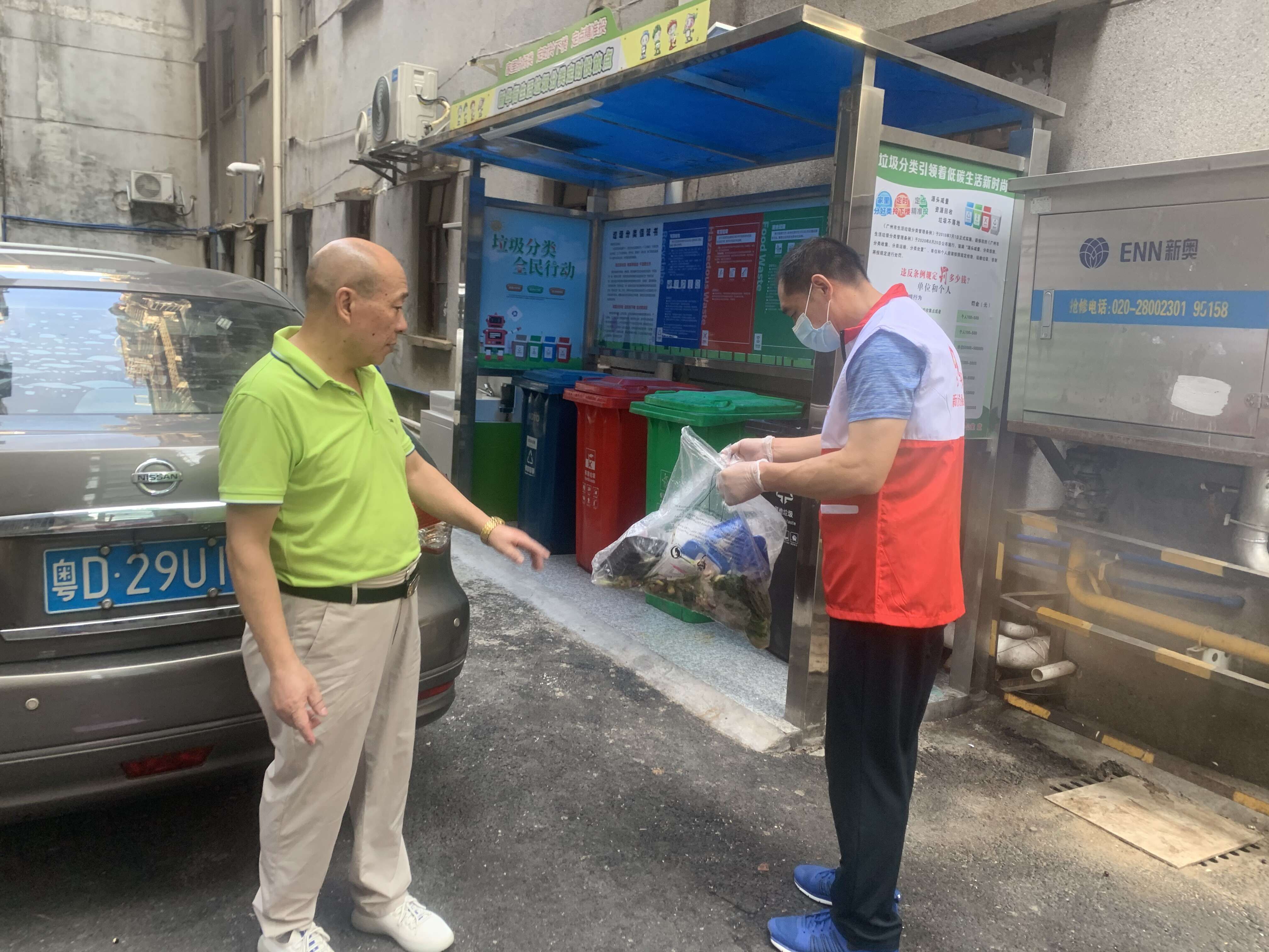 据介绍,花都区新华街道全体领导干部利用周六日休息时间到社区检查垃圾分类工作,并参加党员守桶志愿服务,做好守桶宣传工作,将守桶志愿服务与“我为群众办实事”实践活动相结合,动员在职党员主动回到社区报到为群众服务。