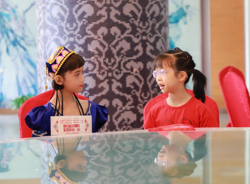 两地的小朋友都是初次见面,大家相互介绍,又是相互赠送礼物,又是拍摄“全家福”合影留念,许婉潼和许婉莹姐妹还与苏爱巴·卡德尔学起了麦西来甫舞蹈。现场气氛热烈,“一家人、一家亲”的暖流洋溢在大家周围。