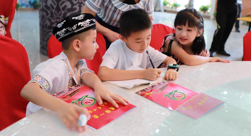 “你平时喜欢玩什么?”陈炳昊问。长睫毛的阿布都克热木·麦麦提艾力顿小声回答:“喜欢玩乐高。”“我也喜欢玩乐高啊!”两个陌生的小男孩立刻化身好友。在接受采访时,看到刚交的朋友写名字笔画错了,陈炳昊还主动当起老师:“这个字的起笔应该先写一竖……”