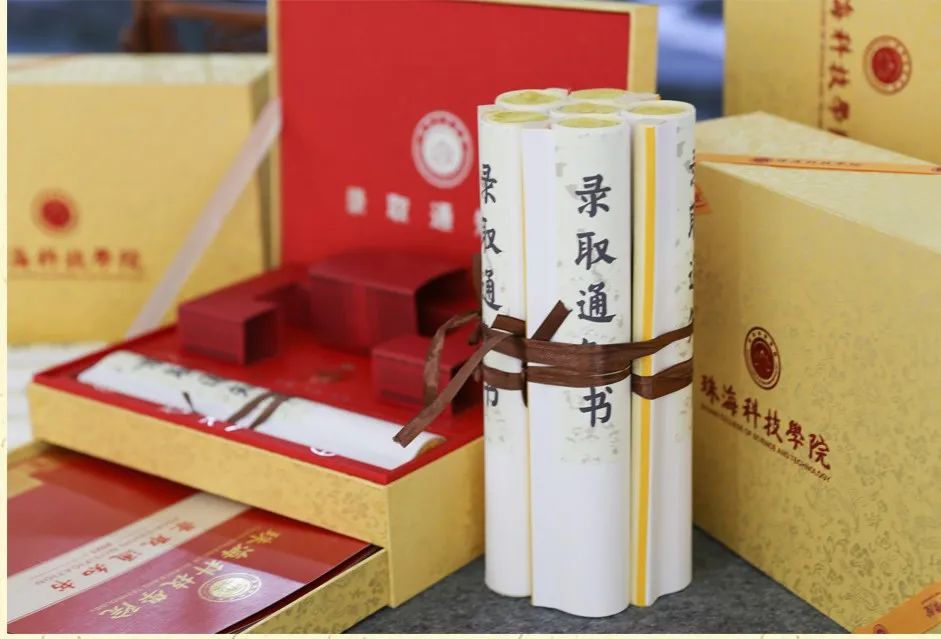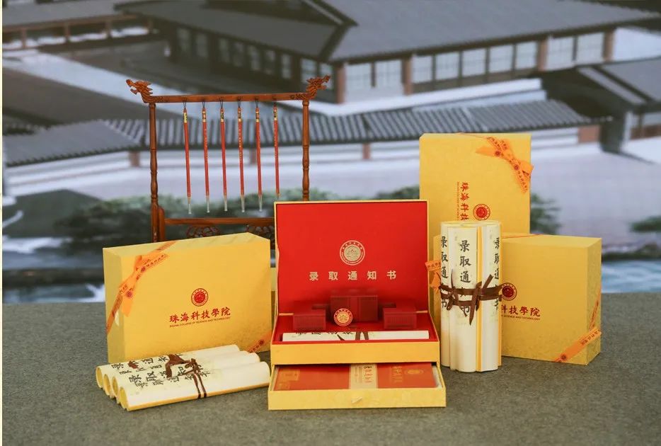 礼盒二层还放置着一份折叠式录取通知书,封面的烫金图案与红色封面搭配精美独特的气质扑面而来。珠海科技学院设计了两份不同样式的录取通知书,折叠式的在新生报到时使用,卷轴式的则可供永久珍藏。
