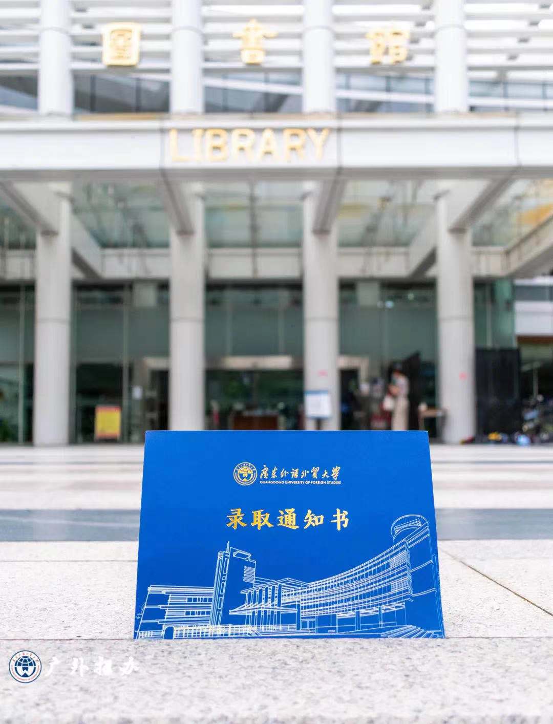今年广东外语外贸大学的录取通知书外页采用“广外蓝”为主体色,上印烫金工艺的校徽校训和黄色简笔线条的南北校区图书馆,彰显庄重典雅。