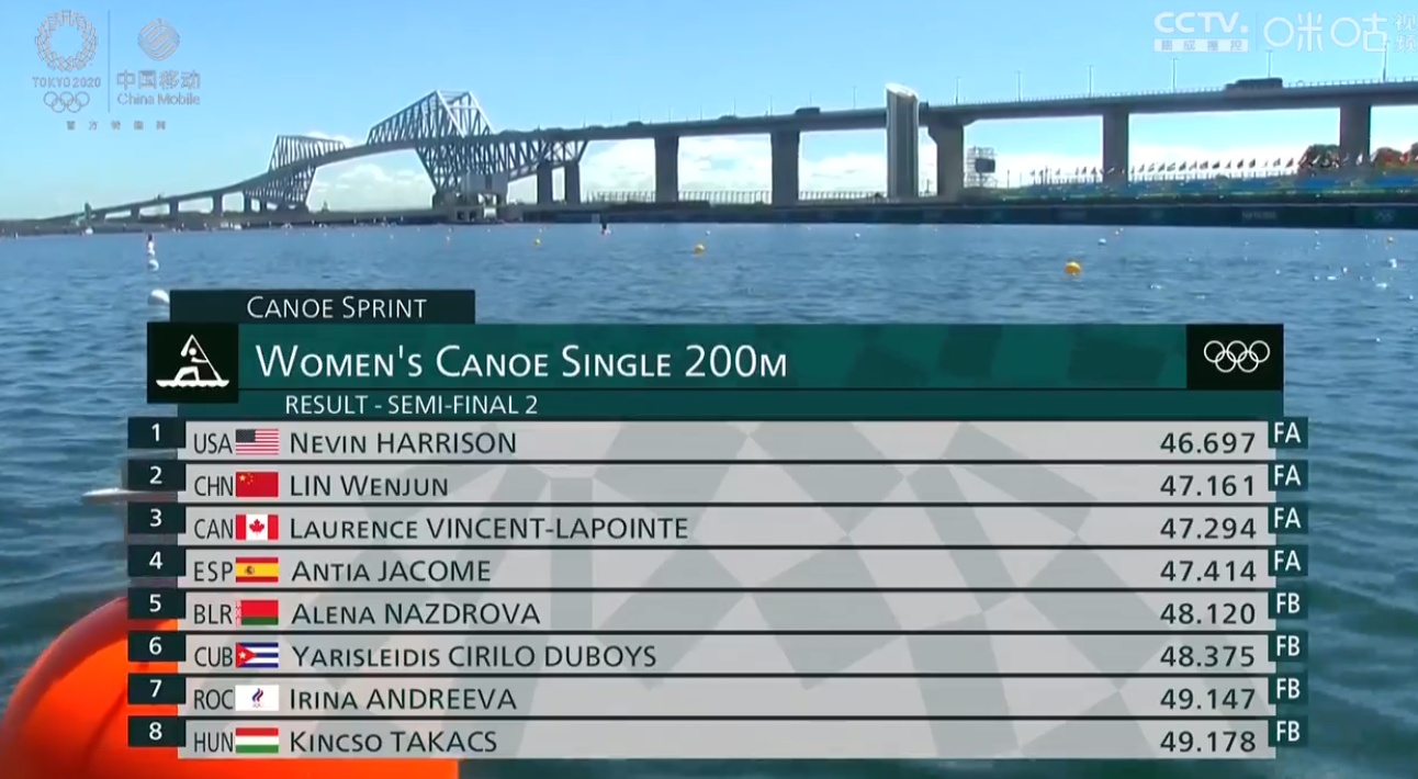 8月5日,在2020东京奥运会女子200米单人划艇半决赛中,中国选手林文君以47秒161的成绩获得小组第二成功闯入决赛。决赛将于北京时间今日10点57分打响。