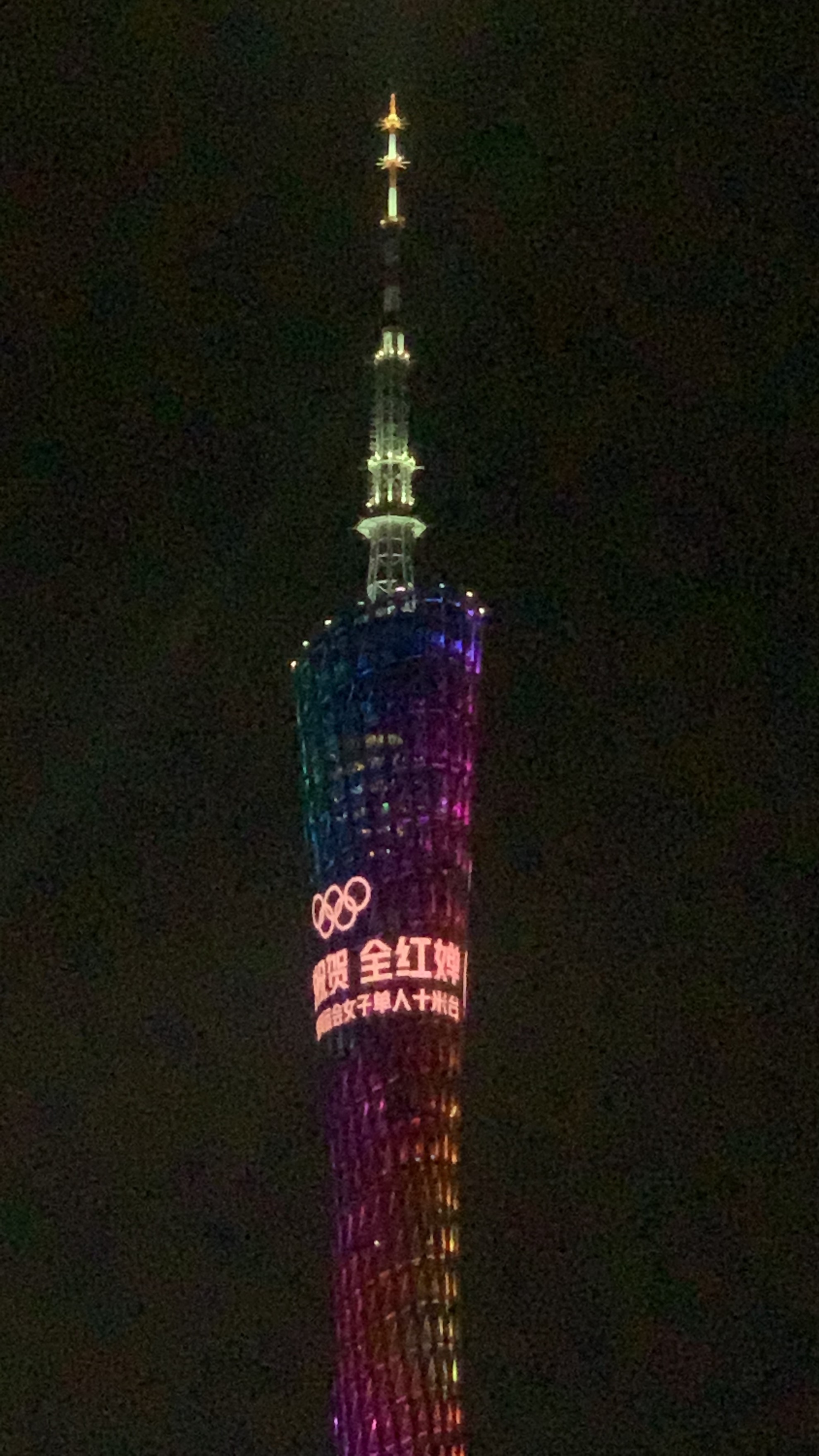 8月5日晚,广州塔为东京奥运会跳水女子10米台冠军全红婵亮灯。来自广东湛江的14岁小将全红婵是中国代表团年龄最小的运动员。今天的比赛中,她被网友称赞上演了“水花消失术”,在第二跳、第四跳、第五跳中三次拿到满分,以总分466.20的超高分夺冠。
