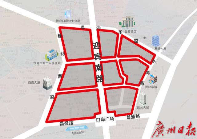 封閉區域示意圖一、對拱北迎賓社區康之源生鮮超市、鮮一街生活超市口岸市場店、鮮多多生活超市、馬得利蛋糕店、肥仔興隆滷味、袁記雲餃、七叔公麵館、友誼酒店樓下菜籃子超市、慧心檢驗拱北候機樓核酸採樣點,嶺南社區海景印社照相館,以及僑光社區中珠大廈鮮一街生活超市、民生堂藥店、中通快遞、菜鳥驛站、僑光花園8棟樓下圓通快遞採取封閉管理,實行「封閉隔離,足不出戶,服務上門」管理措施(暫定14天,具體視疫情防控情況動態調整)。