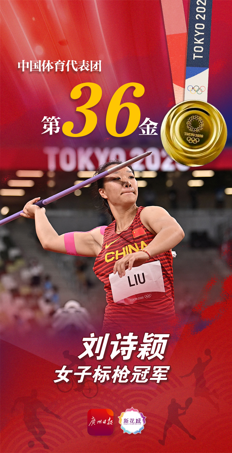 8月6日,东京奥运会田径女子标枪决赛中,中国选手刘诗颖获得金牌。这是中国代表团在此次奥运会中获得的第36枚金牌。
