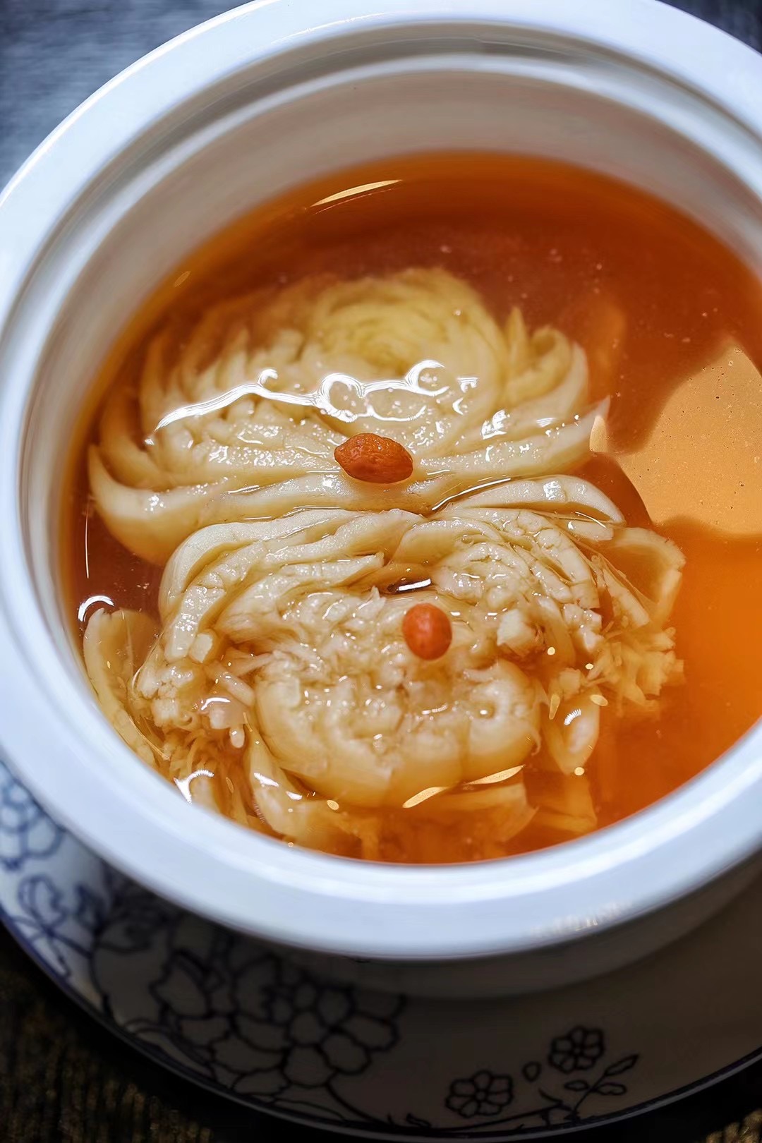 百合是润肺之物,最适宜此时食用。孙师傅用百合煲汤,不加一片火腿一块肉,却能煲出茶汤一般澄明的汤色来。细问之下,无他,竟只是原个鲜百合,在经过深度过滤的镁离子直饮水中,加入杞子、红枣、红萝卜、大豆芽等材料小火慢炖而成。全素的搭配令汤水清澈透明,入口清甜。经过高温熬制的原只百合逐渐舒展,宛如一朵缓缓盛开的白牡丹花。这一道菜,在立秋时节饮用极佳。不时不食,是孙师傅的理念之一。
