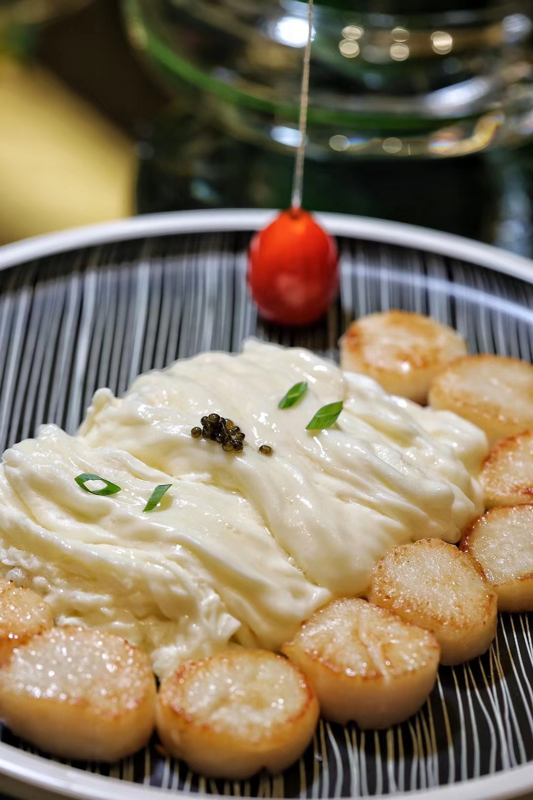 厨师的绝佳功夫,从一道“鱼子酱玉带炒蛋白”中可窥见一斑。这道菜十分讲究火候的掌控和考验师傅的功夫。蛋白混入鲜奶,加入带子粒细火慢炒,一层一层慢炒叠加,炒出一丝丝的层次,炒出来的蛋白比豆腐还要嫩滑。煎至两面焦黄的新鲜带子,搭配蛋白一起品尝,鲜、滑、嫩的口感在舌尖蔓延。