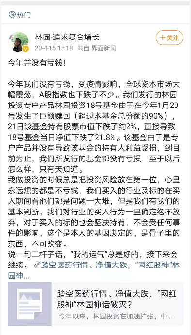 值得注意的是,虽然此次林园怼投资者“亏了钱活该”,但他在去年面对亏钱的质疑时,发表微博称:“我做投资的时候总是把投资风险放在第一位,心里永远想的都是不亏钱,我们买入的行业及标的在买入期间看他们都是问题一大堆,但是我们有我们的基本判断,我们对行业的买入行为一旦确定绝不放弃,对于买入的标的也会坚决持有,不会受任何事件的影响,这个是本人的基因决定的,是骨子里的东西,不可改变。”