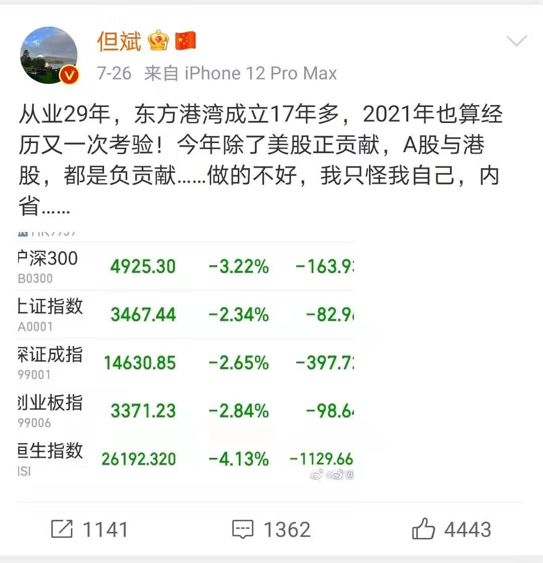 与林园相比,另一位知名私募投资人但斌在投资人面前却谦卑许多。7月26日,沪深两市指数纷纷跳水,但斌于当日晚发布微博道歉称:“从业29年,东方港湾成立17年多,2021年也算经历又一次考验!今年除了美股正贡献,A股与港股,都是负贡献……做得不好,我只怪我自己。”