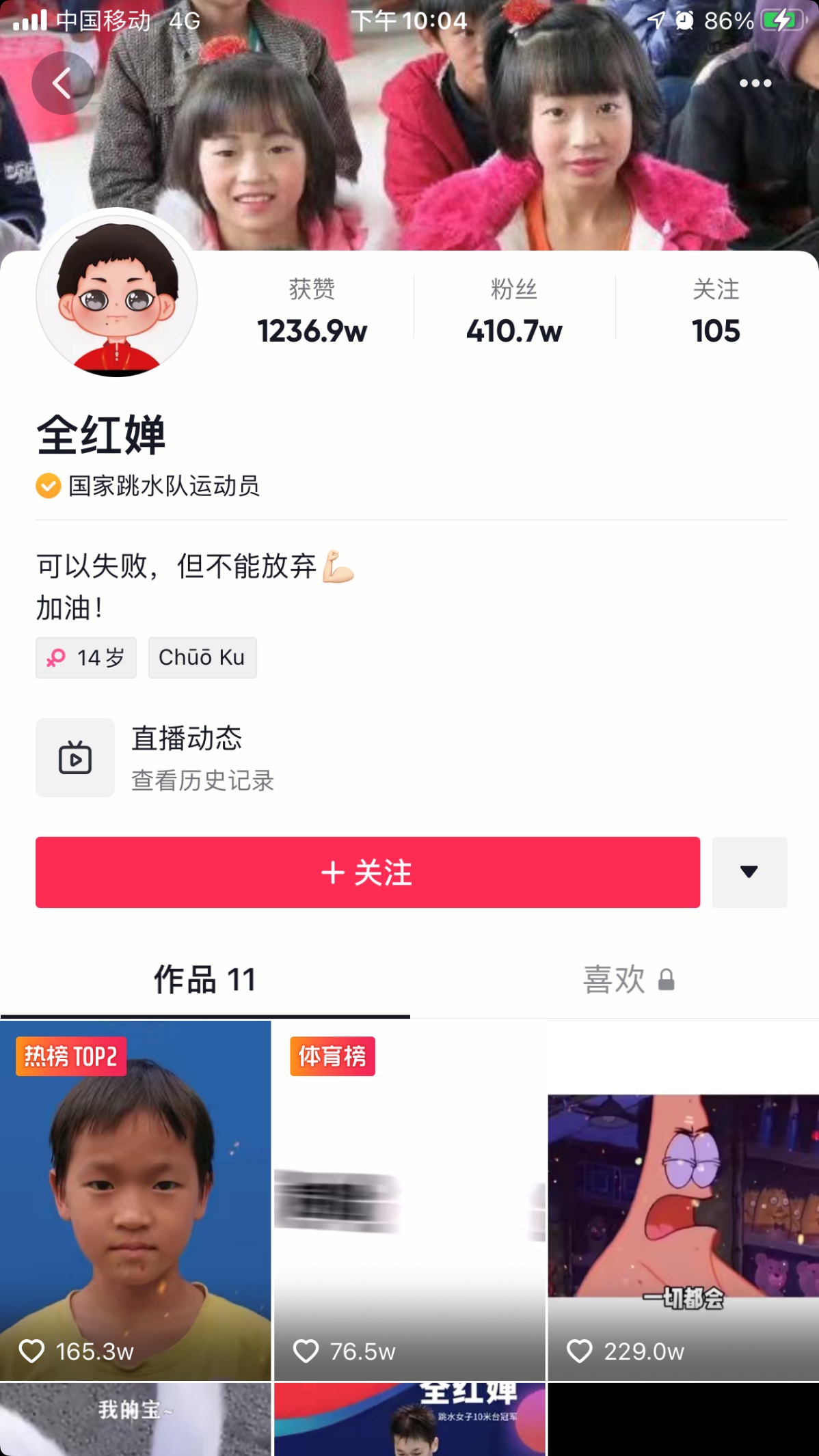 记者注意到,全红婵已于今年6月入住抖音短视频,目前已有410万粉丝,她的介绍很简单,就一句话:“可以失败,但不能放弃,加油!”