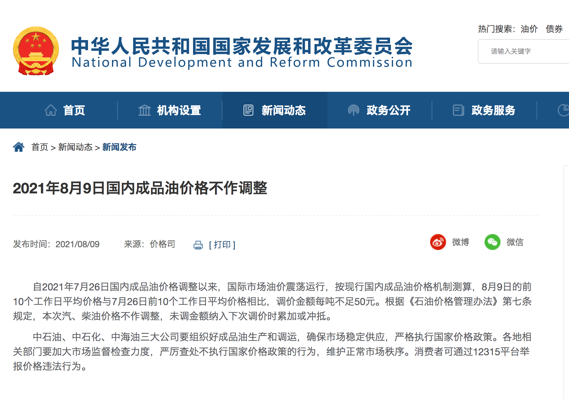 今日,国家发改委官网发布2021年8月9日国内成品油价格不作调整的公告。按现行国内成品油价格机制测算,调价金额每吨不足50元,本次汽、柴油价格不作调整,未调金额纳入下次调价时累加或冲抵。
