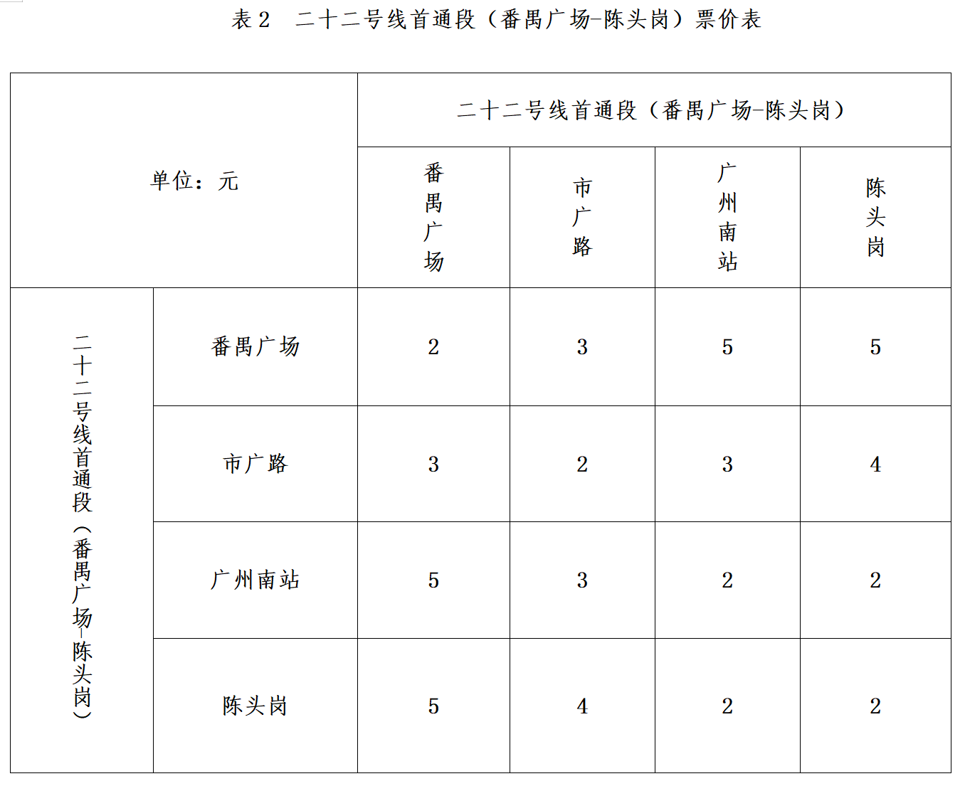 8月9日,广州市发展改革委发布《关于十八号线首通段、二十二号线首通段开通后地铁线网票价的批复》,广州地铁十八号线首通段(万顷沙-冼村)最高票价为11元,二十二号线首通段(番禺广场-陈头岗)最高票价为5元。
