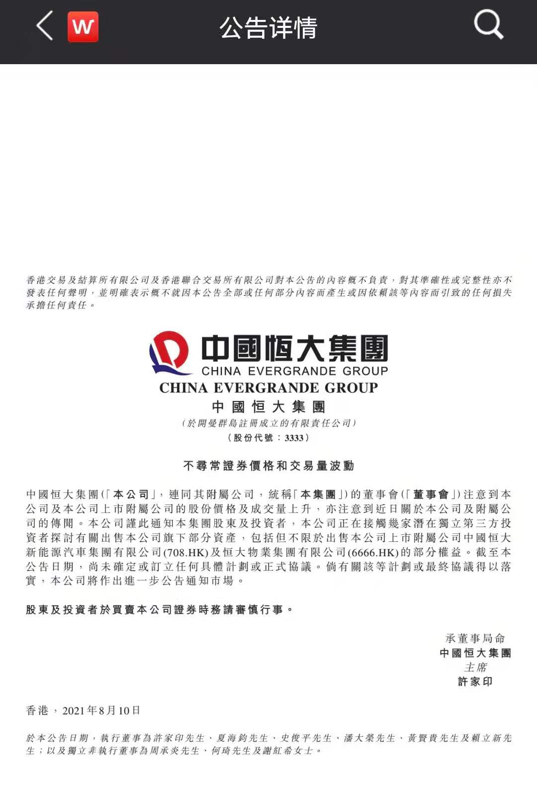 8月10日,中国恒大发布公告,该公司董事会注意到该公司及公司上市附属公司的股份价格及成交量上升,亦注意到近日关于该公司及附属公司的消息。