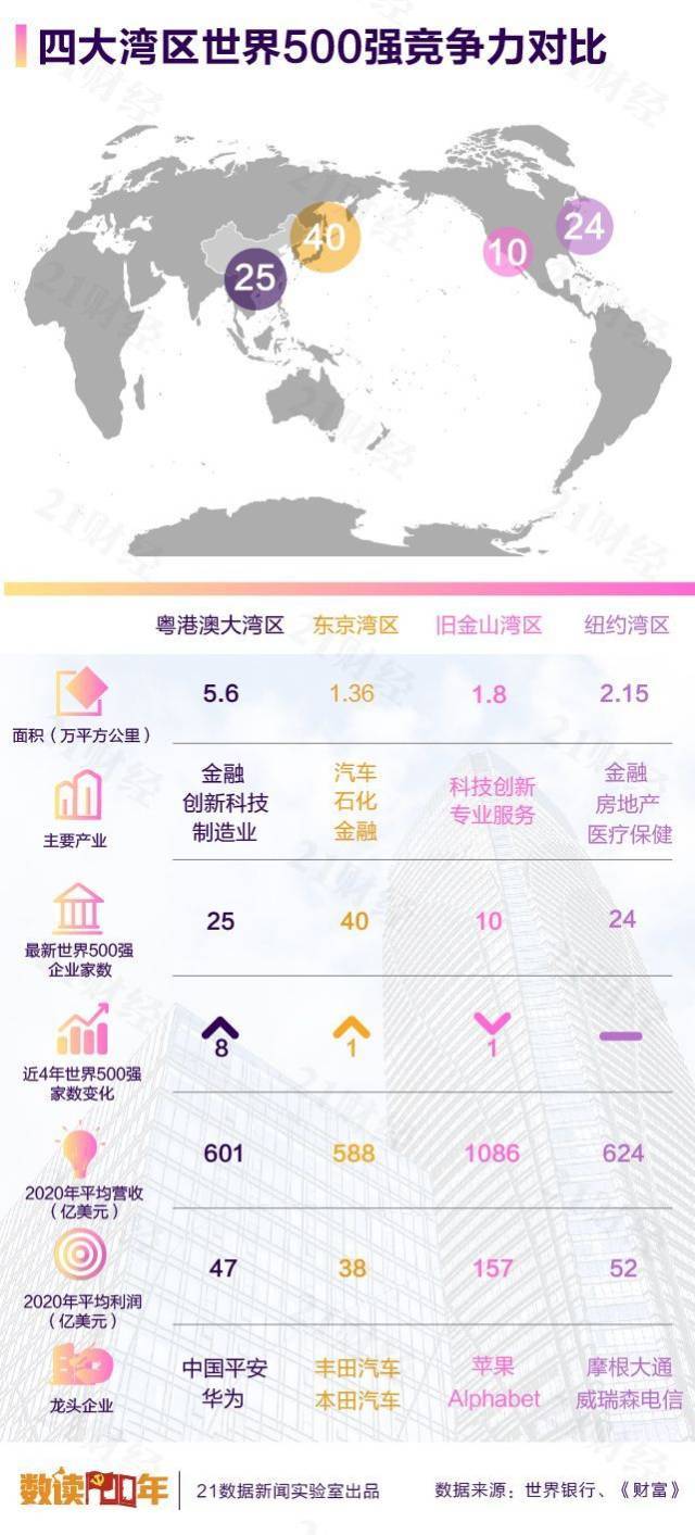 21數據新聞實驗室梳理發現,在最近發佈的2021財富世界500強企業名單中,共有99家企業總部坐落全球四大灣區,數量創歷年新高。粵港澳大灣區已與美國的三藩市灣區、紐約灣區以及日本的東京灣區並駕齊驅,成為全球經濟新的增長極。
