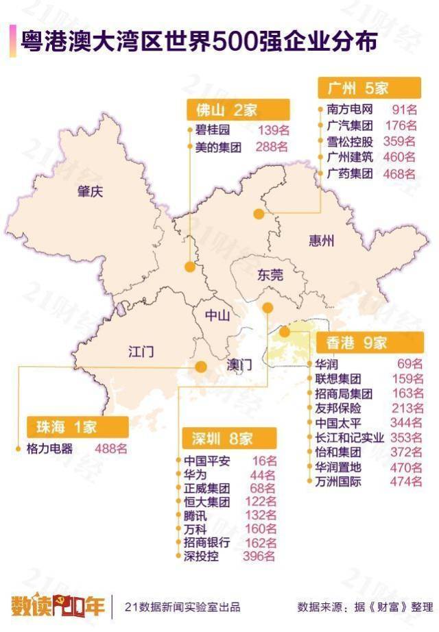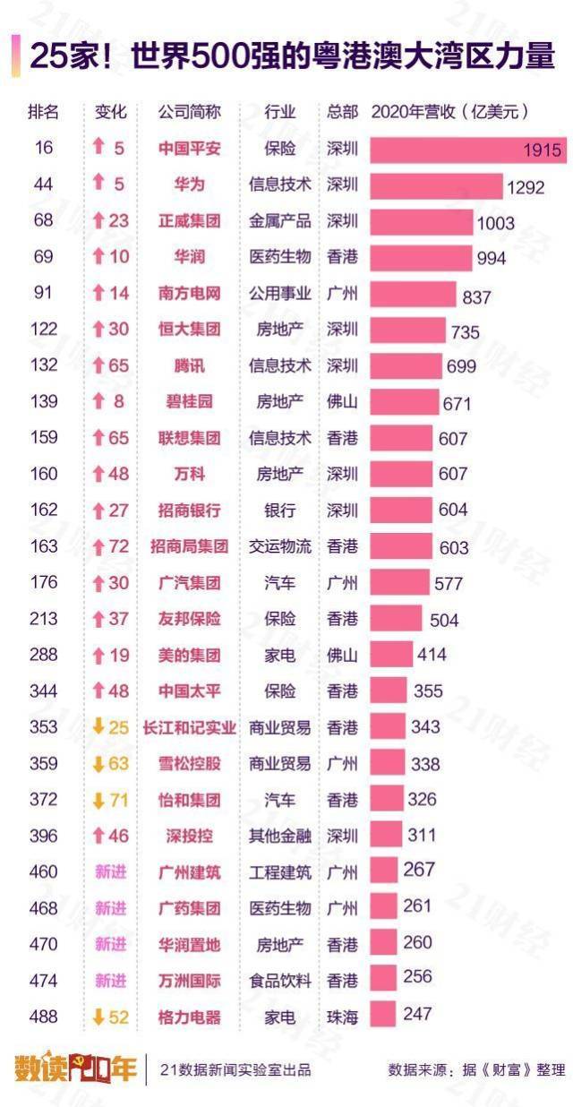 2021年,粵港澳大灣區的世界500強企業達到25家,新增的4家分別為來自廣州的廣州建築、廣藥集團,以及來自香港的華潤置地、萬洲國際。