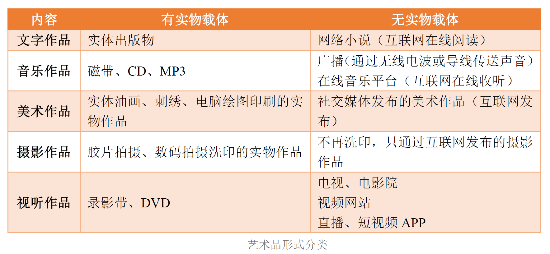 在通俗的理解中,有无实物载体成为了非常重要的标准,与互联网相关的常被认为是数字艺术品——“以使用二进制的设备或方法创作、储存,并通过互联网传播、获取的艺术品,无实物载体”,而相对准确的概念则是“以使用二进制的设备或方法创作、储存、传输或获取的艺术品”。在法律意义上,不存在“数字艺术品”这一法律术语,在判断法律性质时需要依据最终表现的客体内容。
